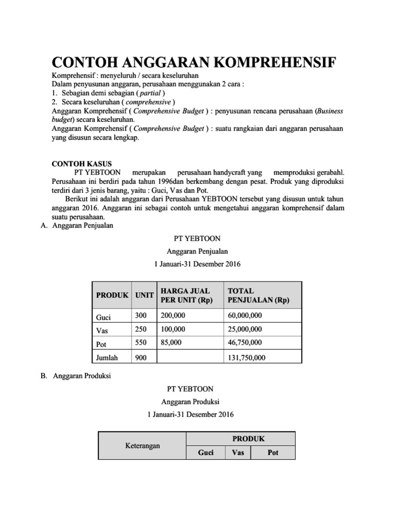Anggaran Komprehensif Komprehensif artinya menyeluruh atau secara keseluruhan. Comprehensive budget Anggaran komprehensif yakni penyusunan rencana perusahaan Business budget secara keseluruhan. Contoh soal anggaran komprehensif.